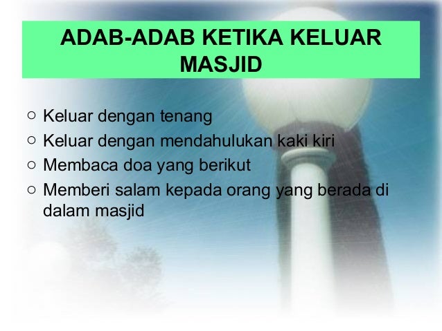 ADAB KETIKA DIMASJID DAN SURAU KETIKA MASUK. A menutup aurat b keluar dengan kaki kanan c keluar dengan kaki kiri 5 apakah perbuatan yang dilarang ketika berada di dalam masjid. Add to my workbooks 0.